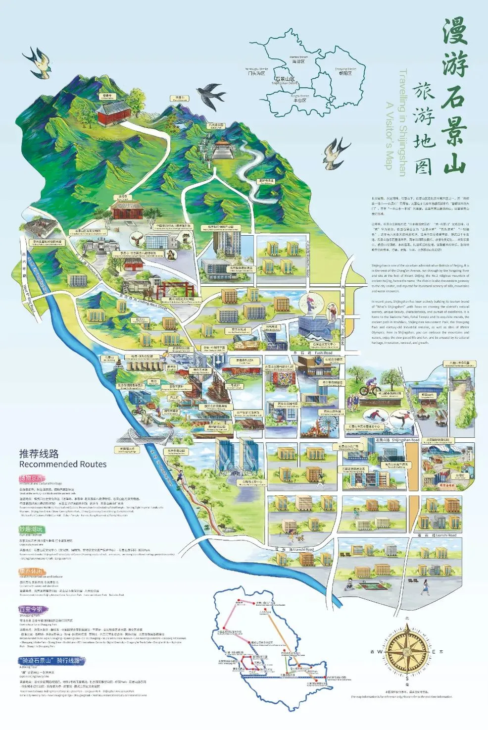 2022石景山旅游地图围绕“秀·石景山”文旅品牌,升级采用2.5D手绘淡彩风格,更具小清新和文艺之风,内容包含手绘地图、推荐线路、来石景山必须体验的50件小事等板块内容。地图正面以“建筑物+核心资源优势”的图标设计,直观形象的标注了游玩观光、餐饮住宿、交通出行等内容,涵盖“吃住行游购娱”全要素共48处重点文旅点位。所有内容均为中英文对照,彰显石景山文旅资源的国际化,助力北京文化中心和国际交往中心城市建设。此外面向亲子家庭、青年群体、老年人等不同群体,从文博探访、潮酷欢乐、都市休闲、首钢园打卡、城市骑行等角度,推荐“博物京西”“妙趣潮玩”“康养休闲”“百变金刚”“骑迹石景山”5条游玩路线,引导游客更加便捷、更加深度的体验石景山。