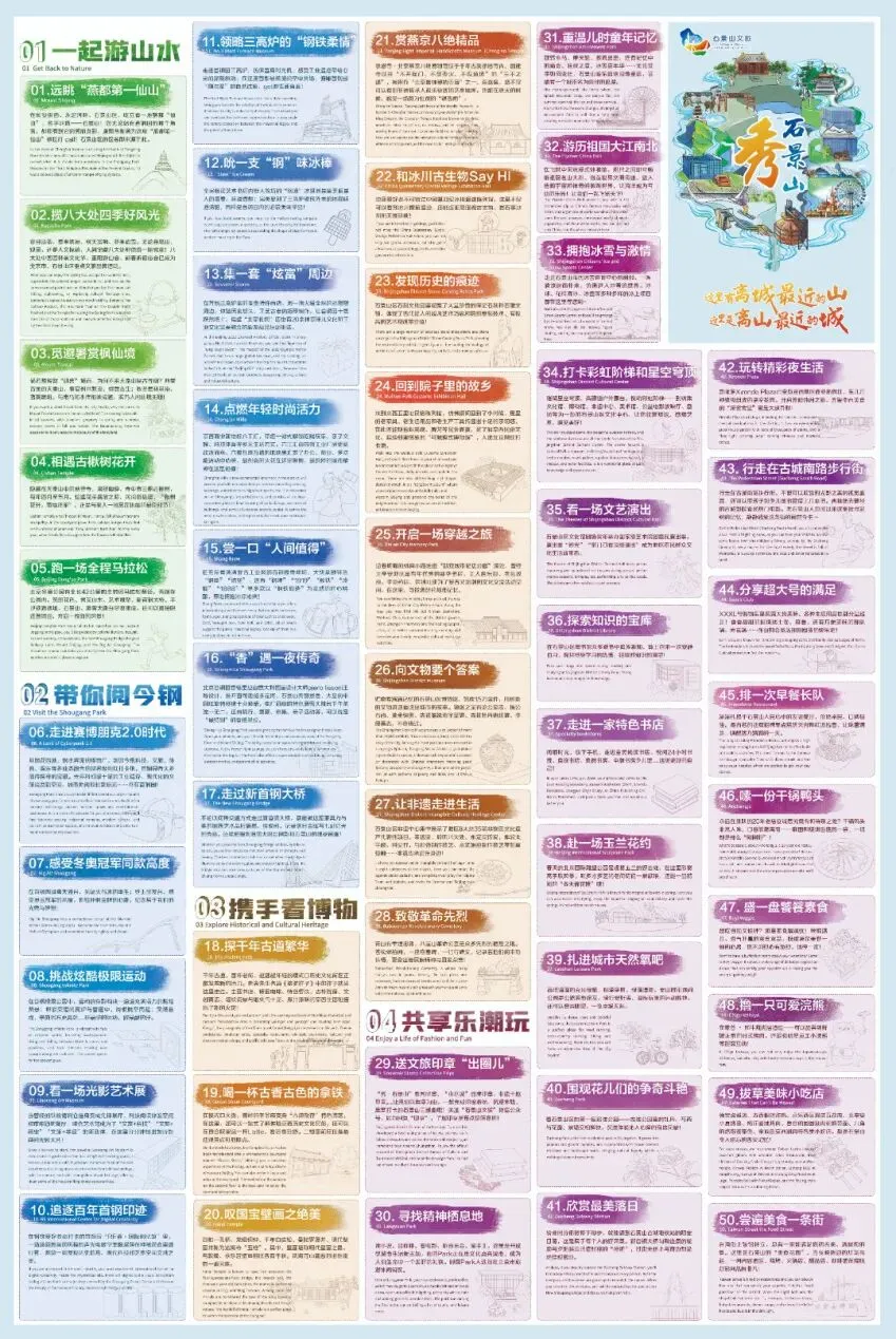 地图背面设置“一起游山水”“带你阅今钢”“携手看博物”“共享乐潮玩”四大主题,结合社交媒体热门话题和市民游玩需求,总结梳理出来石景山必须体验的50件小事,为游客呈现不一样的石景山旅游打开方式,同时增强游玩的体验感和获得感。