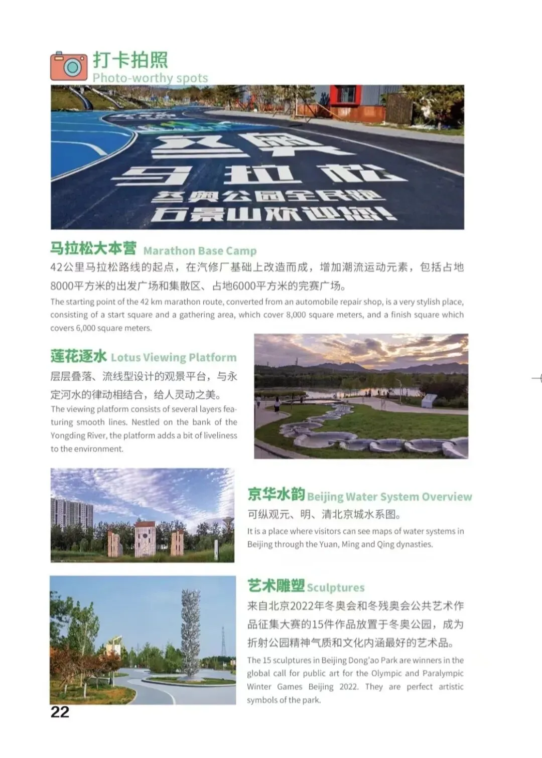 在内容上增加了重点文旅点位可以挖掘的历史故事和传说,使手册内容更富有生命力,并加入手绘故事长图文及手账清单,增加阅读的趣味性,能够与之产生共情。特别设置了打卡拍照内容一栏,一键式解锁网红拍照打卡小攻略,让您跟着手册便能拍出惊艳朋友圈的优质大片儿!手册里还有印章控们最爱的石景山文旅印章集章小教程,等着您去发现~让我们在“漫游石景山”旅游手册里,一起玩转石景山。