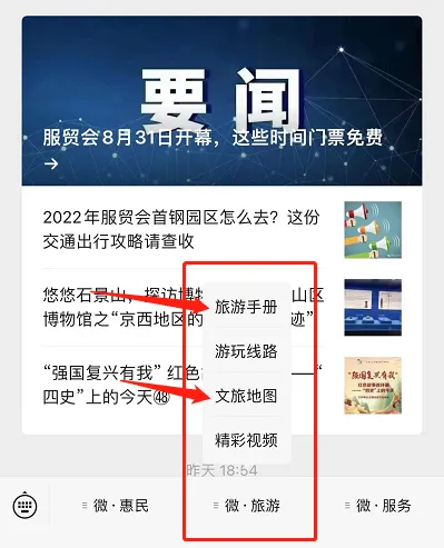 为了更好的服务于2022年服贸会的举办,石景山文旅局将于服贸会期间在首钢园文旅服务展区、展商入住酒店、志愿服务站、商务考察活动等场合发放中英文版2022“漫游石景山”旅游地图及旅游手册。因纸质版宣传物料数量有限,我们在“石景山文旅”公众号同步更新了2022石景山旅游手册和旅游地图电子版,大家可在“石景山文旅”公众号首页菜单栏中点击“微·旅游”一栏,便可查找到,可以让您先睹为快!