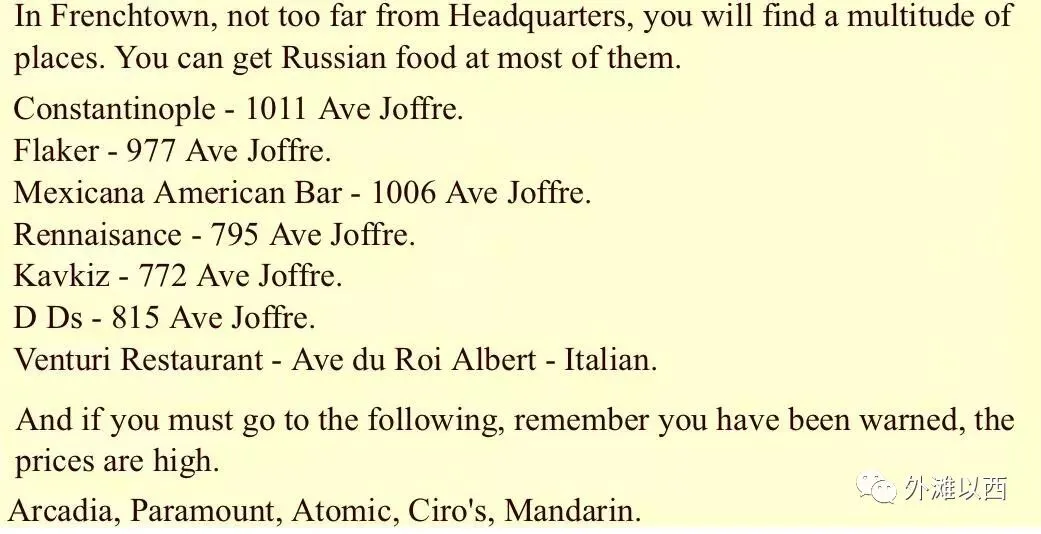 上海生活还是丰富的哦。那一串饭店多在霞飞路,有点奇怪,1943年不是改成林森中路了吗?昨天写的”小维也纳“代表餐厅FLAKER(伟达饭店底商)也榜上有名,其他的康斯坦丁伯里餐厅、卡夫卡高加索餐厅、文艺复兴西餐社等都被推荐,等待官兵们来饕餮聚餐。链接点进去看看:《霞飞路上喝咖啡吃大菜》。