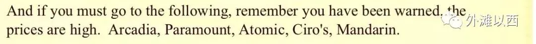 如上是有情提醒;有些消费场所价格很贵,如爱垲第,不是张园以前那个哦,指的是在今天巨富长中心地带上悟锦世纪大厦以前是个大饭店和夜总会;百乐门还在静安寺附近;Atomic不太清楚位置,仙乐斯已经被拆了起了仙乐斯大厦,Mandarin在静安寺路、西摩路口。链接点进去看看:《南京西路、陕西北路十字路口请留步》。