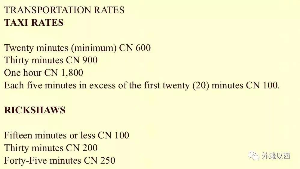 1945年的上海“叉头”(从英语单词charte来的)价格,还没有金圆券。TAXI是出租车,四个轮子;RICKSHAWS是人力车,也叫黄包车,两个轮子和两条腿跑的。链接点进去看看:《上海滩满城跑着黄包车》。