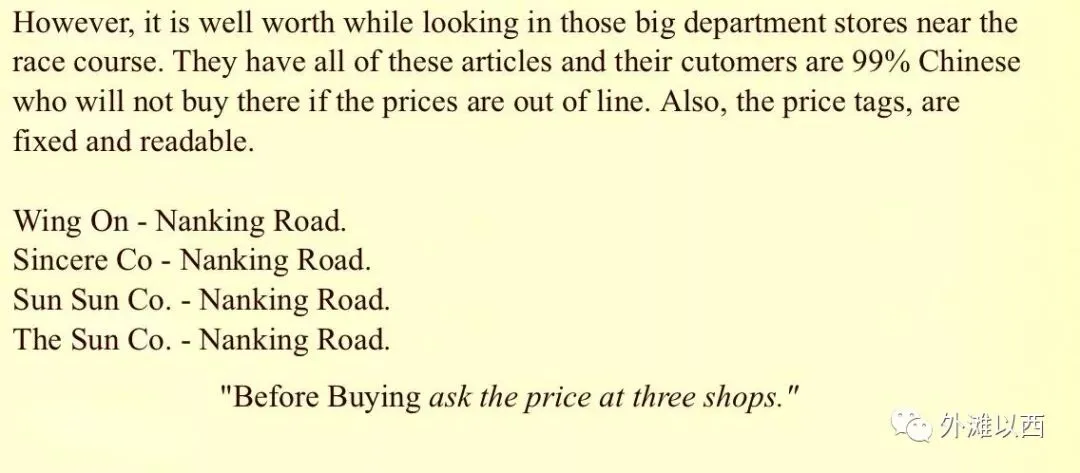 买东西首选是四大百货,当然,南京(东)路的福利公司也可以逛。又出来斜体字重点来了,这句话大家都懂,货比三家。