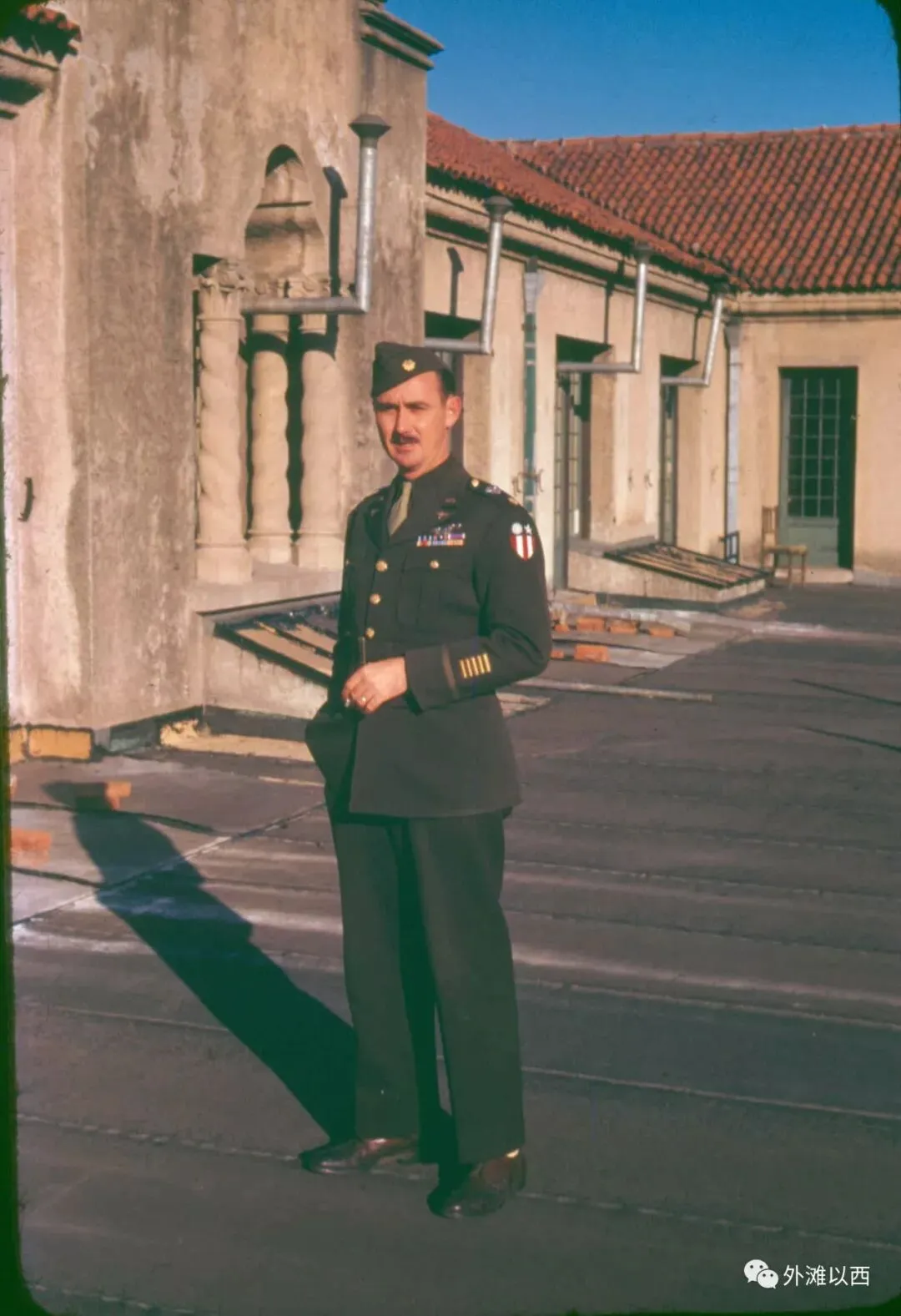 在拉森和迪柏两位喜欢拍彩照的美国兵之后,到上海游玩的美国军人也留下了不少彩照。如下,站在美国乡村总会露台上。