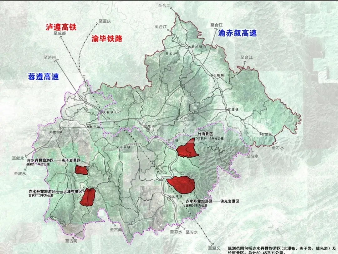 ✅ 衔接区域:辐射赤水城区及天台、复兴、丙安、大同、两河口、元厚等乡镇,范围约1036平方公里,串联起赤水河谷、东西旅游环线等核心文旅节点;