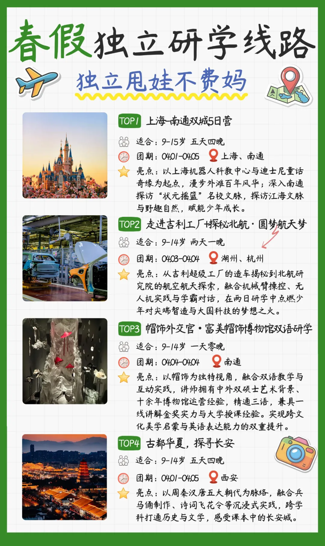 想让孩子跳出课本、锻炼独立能力? 从上海的科技童话双城,到吉利工厂的智造探秘,从富美帽饰的跨文化美学,到十三朝古都的历史寻根,每一条线路都把「玩」和「学」揉进细节里,让娃在行走中开阔眼界,在实践中收获成长,家解放双手!