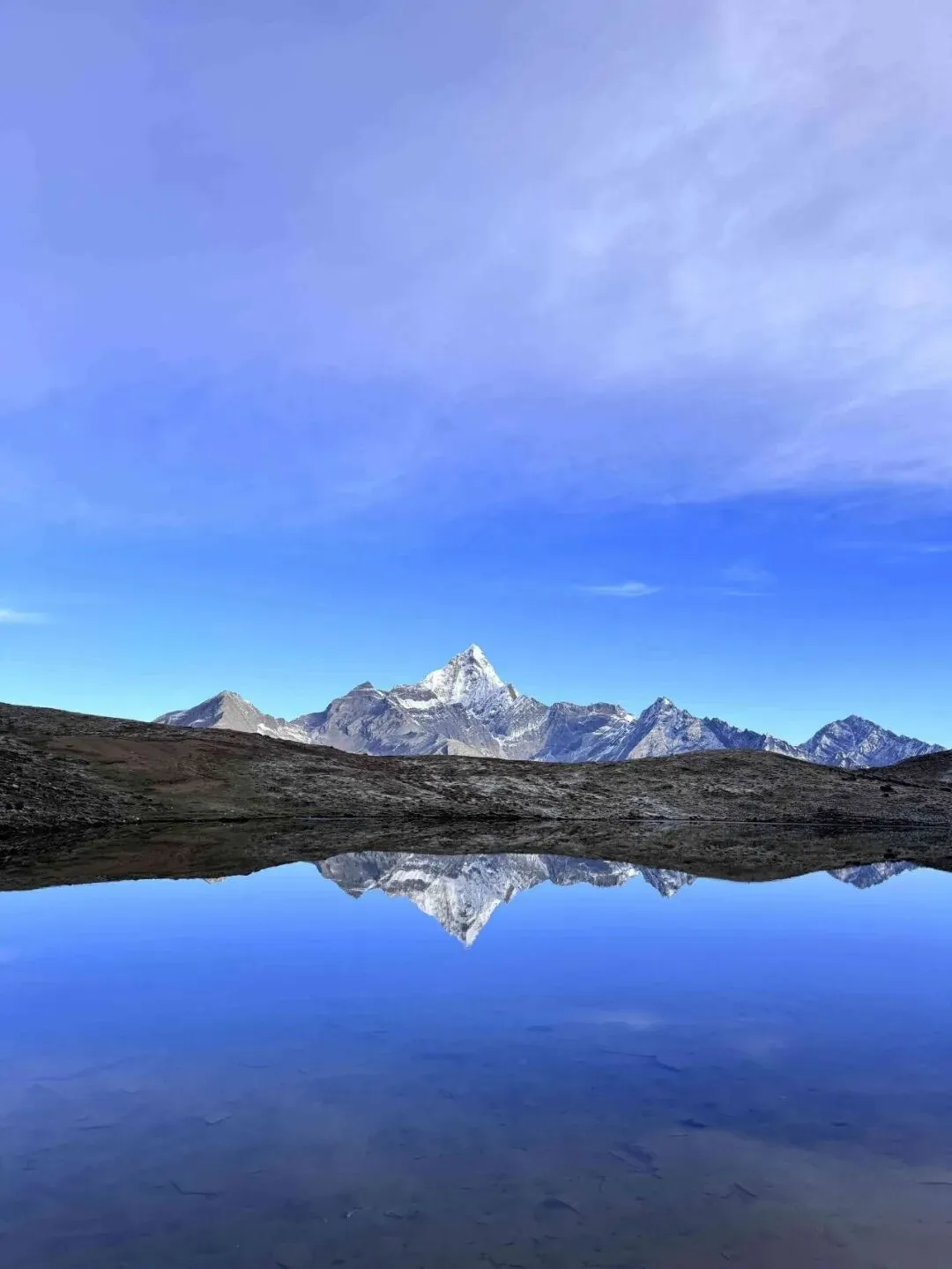 爬子梅垭.口那.天,云突然散了,.贡嘎.主峰就这么杵在眼前..近得.让人忘了呼.吸。.山脚下的泉华滩,..化池像.打翻的.调色盘.