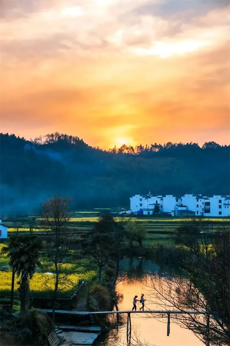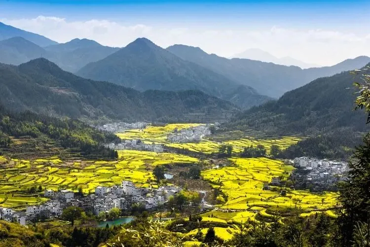 油菜花衬徽派古村、
