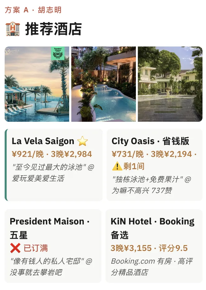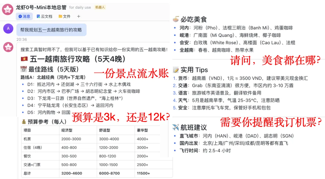 如果你直接问一只“野生”龙虾:“五一去越南怎么玩?” 它给你的回复大概率是:一段密密麻麻、看似丰富实则毫无执行性的文字。你还是得自己去小红书翻笔记、携程比价、Booking 订房……这种低信息密度的“赛博垃圾”,正是旅行前最让 P 人崩溃的体力活。老板要的是答案,不是建议。