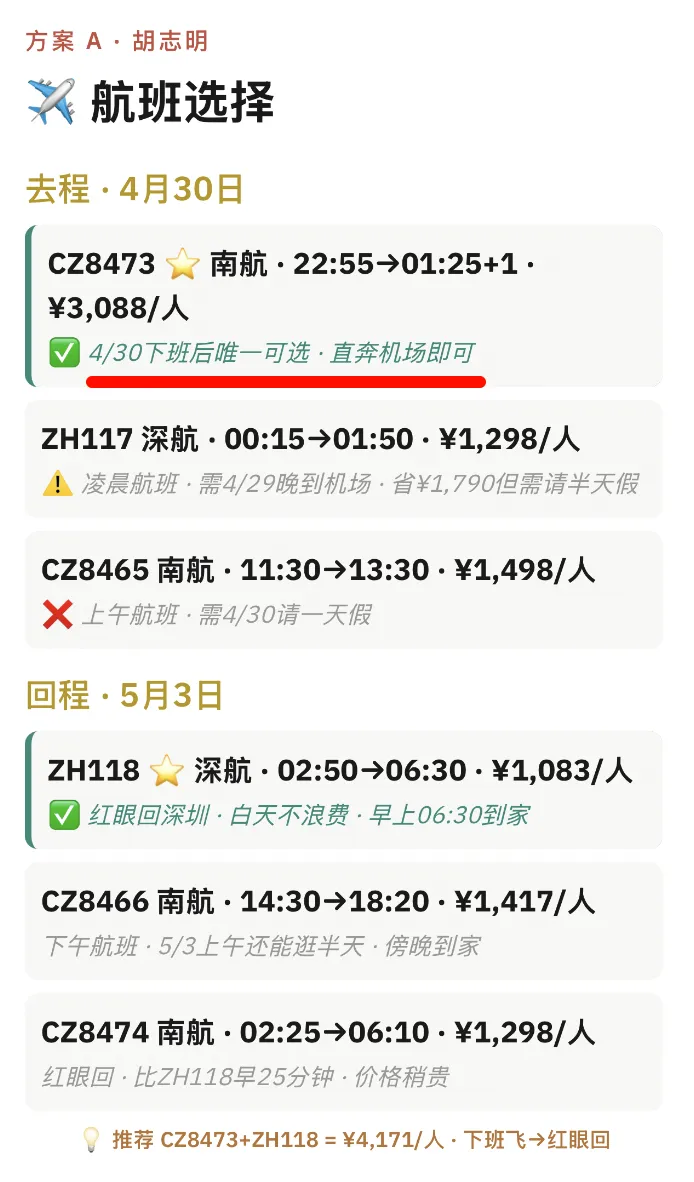 5. 财务专家上线:精确到元的预算单 基于前面的调研,🦞虾秘会推算出每一程的交通费、人均餐费和机酒开销,最后给出一张精确到元的预算清单。它甚至会给出优化方案:比如“请假一天可省 3600 元机票”,或者“换到另一个网红酒店可省 800 元”。