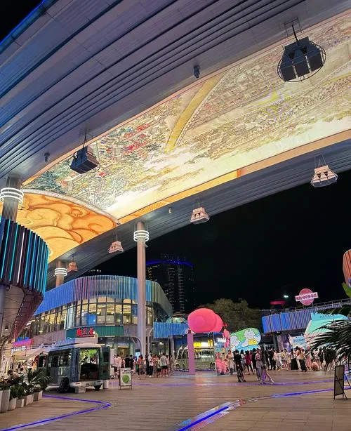 天幕城是个很特别的地方,它不是传统景点,是一条有着巨型穹顶的室内商业街,但它真正有意思的地方不是购物,而是那个仿造的老青岛街景。你一走进去,头顶是蓝天白云的投影,两边是民国时期的建筑外立面,电车轨道、石板路、老字号招牌,全都按照历史照片复原出来,这种沉浸式的场景设计,让你一瞬间有种穿越的错觉。
