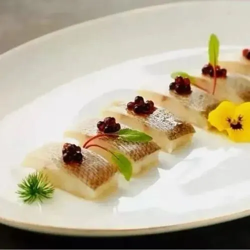 凝脂般的鱼冻藏着午笋的鲜,莓果点色,花影衬盘,是舌尖上的琉璃春宴。