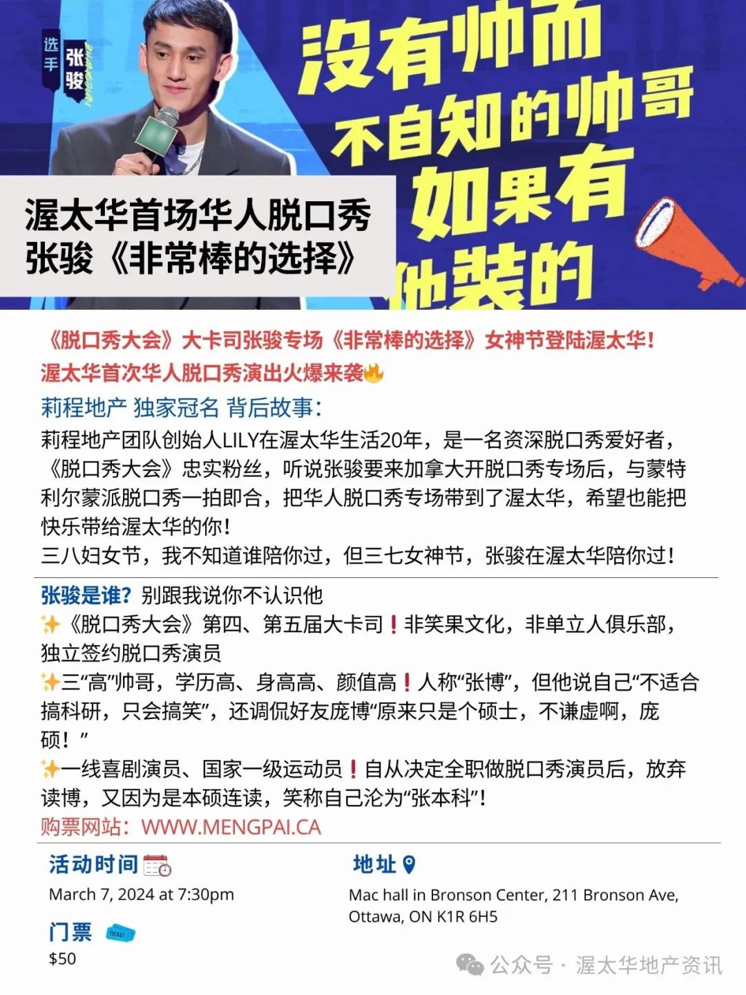 莉程地产团队创始人Lily在渥太华生活20年,是一名资深脱口秀爱好者,《脱口秀大会》忠实粉丝,听说张骏要来加拿大开脱口秀专场后,与蒙特利尔蒙派脱口秀一拍即合,把华人脱口秀专场带到了渥太华,希望也能把快乐带给渥太华的你!