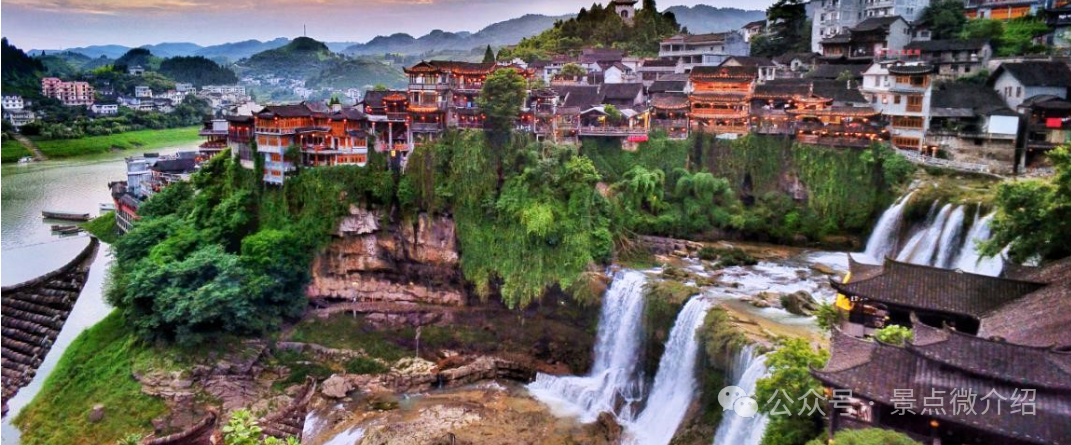 2、芙蓉镇:隶属于湖南省湘西土家族苗族自治州永顺县。芙蓉镇是国内唯一悬挂在瀑布上的古镇,拥有两千多年的历史,与龙山里耶镇、泸溪浦市镇、花垣茶峒镇并称为“湘西四大名镇”,也有酉阳雄镇、“小南京”的美誉。这座古镇三面环水,整座古镇从岩溶台地的边缘起,依靠地势逐渐上升,妥妥的安坐于一块陡峭的石灰岩台地上,可以说是最具有湘西性格的古镇。古镇处处是曲折幽深的大街小巷,临水依依的土家吊脚木楼以及青石板铺就的五里长街,处处透析着淳厚古朴的土家族民风民俗。芙蓉镇最值得观赏、最吸引眼球的是那倾泻而下的大瀑布。瀑布旁的“土王行宫”也是芙蓉镇的一大亮点。