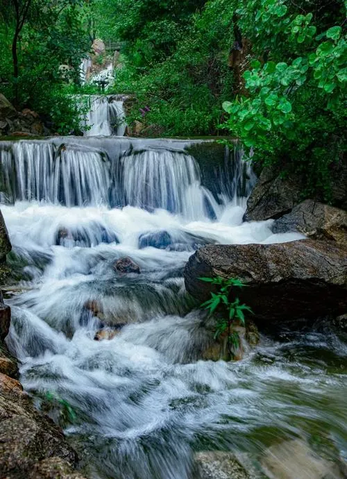 北方缺水是常识,但九如山的存在让这个常识打了个问号,这里有三十六处瀑布,大大小小的水流从山涧里冒出来,不是那种人工造景的涓涓细流,是真的哗啦啦往下冲的瀑布,你站在栈道上能感觉到水汽扑面而来,这种体验在北方是很难得的。