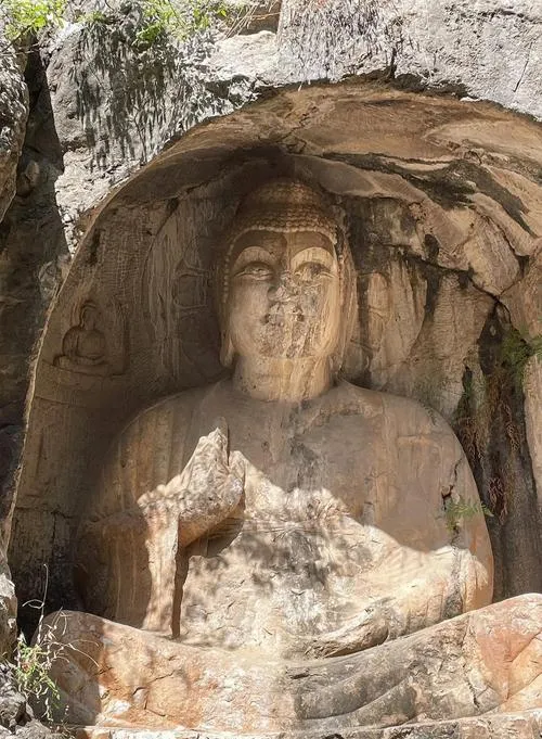 大佛头这个名字听起来有点随意,但你到了现场就会明白为什么叫这个名字,因为这里真的有一个巨大的佛头雕刻在山体上,这个佛头的存在让你重新理解了什么叫规模感,不是那种通过数字和文字描述出来的规模,是真的站在下面往上看,脖子要仰到酸的那种规模。