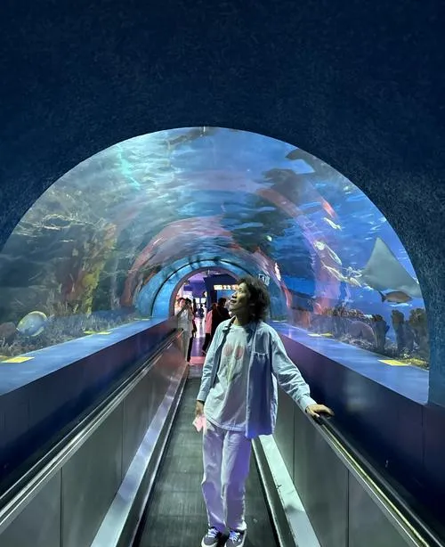 海底隧道那一段是整个馆最经典的设计,你走在下面,鱼从头顶游过去,鲨鱼、鳐鱼、海龟就在身边,这种沉浸感特别强,但更重要的是它让你看到"人在自然里有多渺小",那些大鱼随便一条都比人大,速度比人快,适应能力比人强,你站在那会自然而然地意识到,人类只是这个星球上的一种生物,不是主宰,这个认知对小孩特别重要,因为他们需要知道世界不是围着人转的。