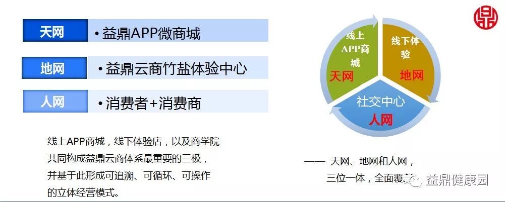 益鼎健康将传统文化、大健康、互联网融为一体,由线上APP微商城、线下实体体验店、商学院三部分组成,形成可追溯、可循环、可操作的立体运营模式。
