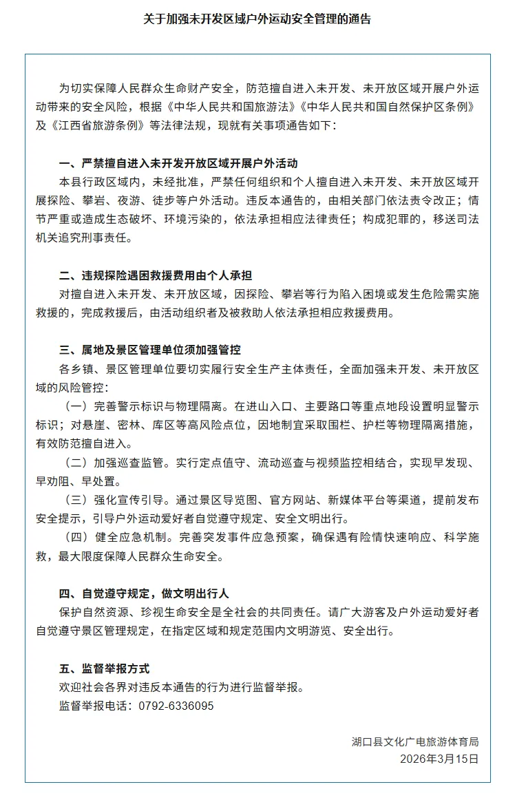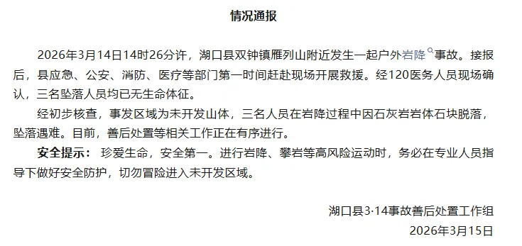 据“湖口发布”消息 3月14日14时26分许 江西九江湖口县双钟镇 雁列山附近发生一起户外岩降事故 三名坠落人员均已无生命体征