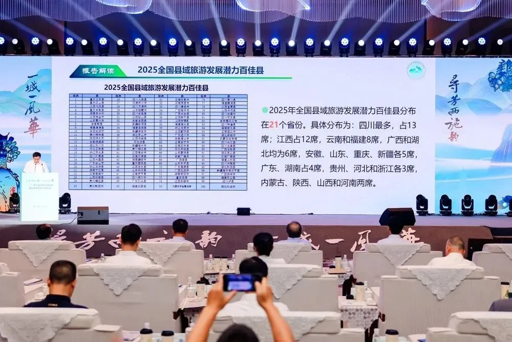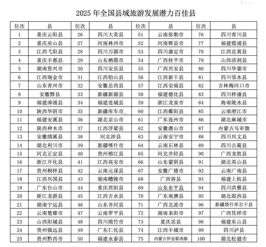 2025年全国县域旅游发展潜力百佳县分布在21个省份。四川最多,占13席;江西占12席,云南和福建8席。重庆云阳、重庆巫山、江西弋阳、重庆丰都、湖南资兴、江西瑞金、山东青州、安徽黟县、福建漳浦、陕西华阴位列前十位。山东省东平县首次上榜。