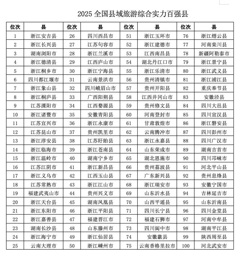 浙江安吉县连续第七年位居全国县域旅游综合实力百强县榜首,新疆成为最大“黑马”,90个县域实现旅游指标双增长。