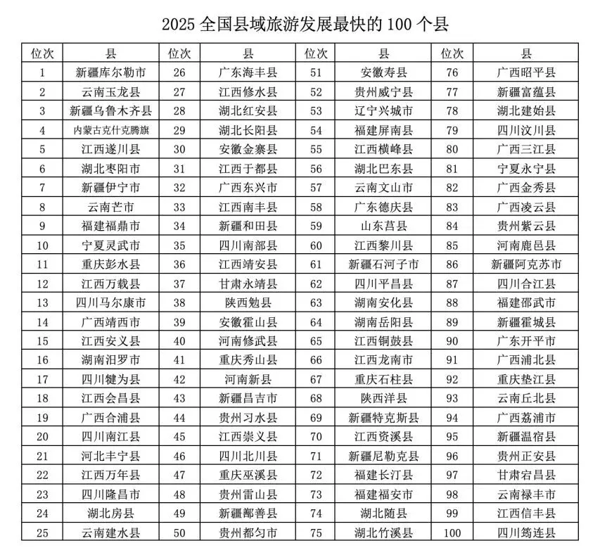 2025全国县域旅游发展最快的100个县中,江西最多,占16席;新疆紧随其后,占13席。新疆库尔勒、云南玉龙、新疆乌鲁木齐县、内蒙古克什克腾旗、江西遂川、湖北枣阳、新疆伊宁、云南芒市、福建福鼎、宁夏灵武名列前茅。