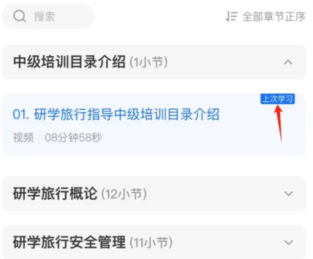 4、线上课程具有进度保存功能,再次听课,可选择“上次学习”,即可跳转剩余时间的学习。