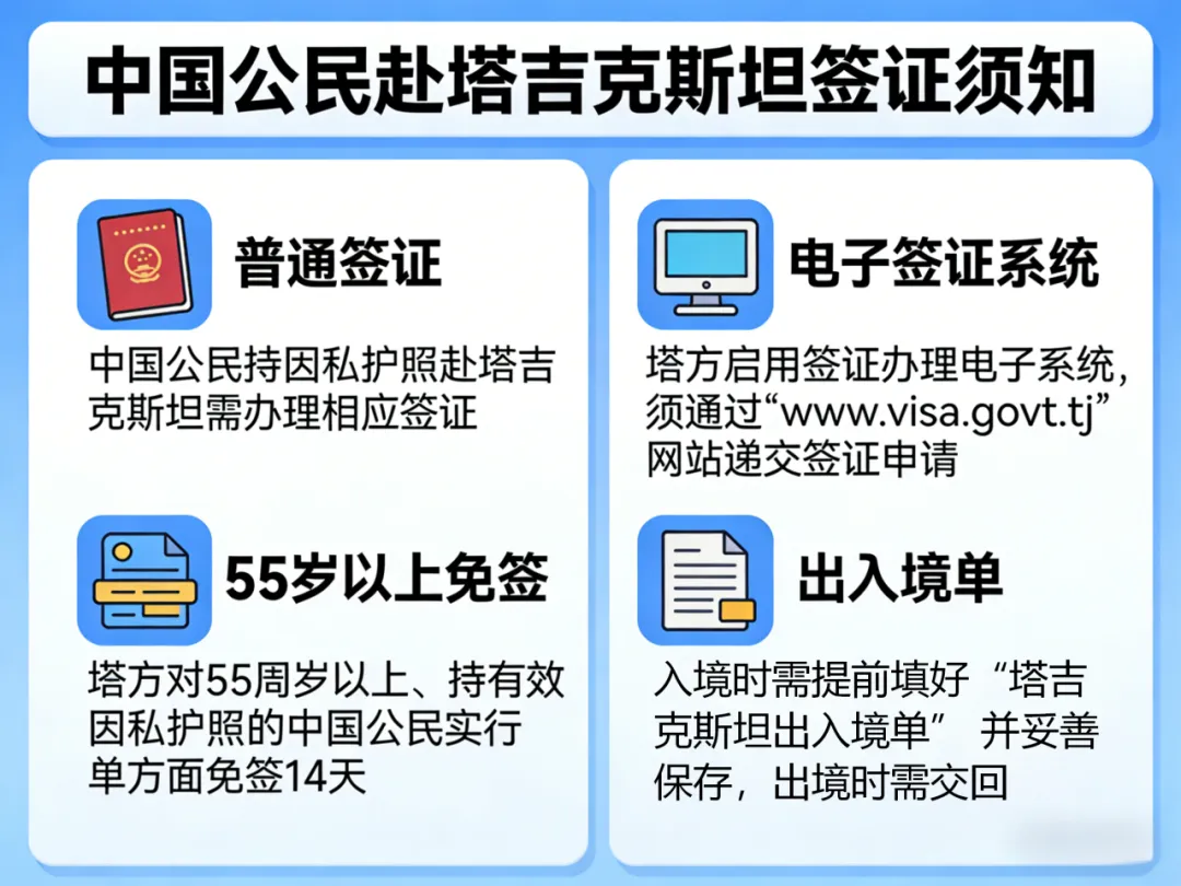 签证须知:中国公民持外交、公务、公务普通护照赴塔免办签证准予停留30天。如停留期超过30天,需前往塔领事总局办理签证续签手续。中国公民持因私护照赴塔需在入境前到塔吉克斯坦驻华使馆办理相应签证;如要申请塔吉克斯坦落地签证,必须提前办好塔吉克斯坦外交部确认的签证邀请函,方可在机场办理落地签证。自2024年5月1日起,塔方对55周岁以上、持有效因私护照的中国公民实行单方面免签14天。自2017年1月1日起,塔方启用签证办理电子系统,须通过www.visa.gov.tj网站递交签证申请。入塔境时需提前填好“塔出入境单” ,请务必妥善保存,出境时需交回塔边检。