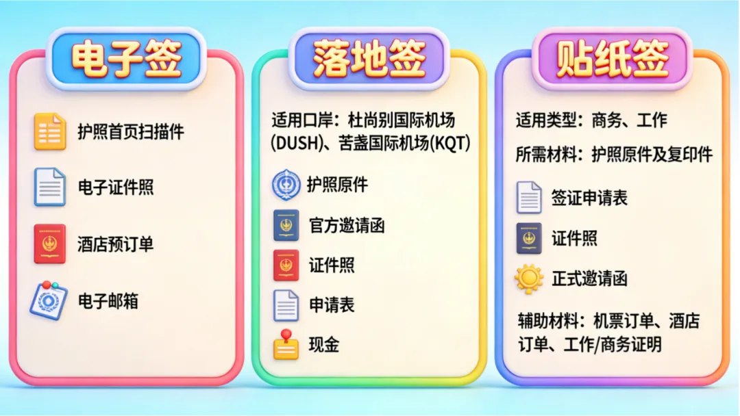 贴纸签证(通过使领馆)- 适用于商务、工作等:护照原件及复印件、签证申请表填写完整并签名、2张白底彩色证件照、由塔方邀请单位通过塔外交部签发的正式邀请函(旅游邀请需旅行社办理)、其他辅助材料如机票订单、酒店订单、工作或商务证明等。