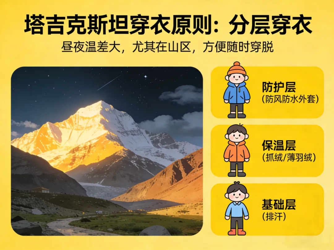 帕米尔高原:白天舒适,夜间寒冷。穿搭:白天可短袖+皮肤衣,但必须携带厚外套(抓绒/薄羽绒)、长裤和帽子以备夜间保暖。