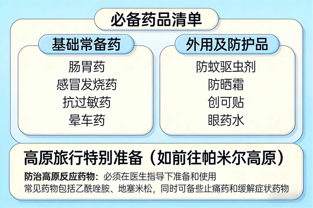肠胃药:止泻药(如蒙脱石散)、肠胃调节剂(如益生菌)、抗酸药(针对胃灼热);感冒发烧药:解热镇痛药(如布洛芬、对乙酰氨基酚);抗过敏药:氯雷他定、西替利嗪等(应对花粉、食物过敏);晕车药:如果您计划长时间乘坐山区公路;抗生素:仅限处方药,如广谱抗生素(如阿莫西林),用于应对严重细菌感染。必须在医生指导下使用。