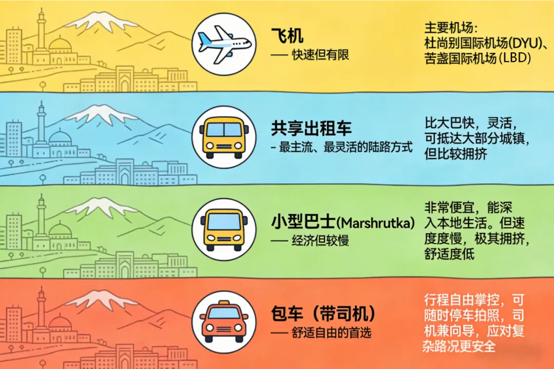 主要机场:杜尚别国际机场(DYU)、苦盏国际机场(LBD)。连接杜尚别与苦盏、霍罗格(帕米尔首府,航班少且易取消),或从境外直达。节省时间,避免长途陆路颠簸。但航线少,航班可能因天气(尤其在帕米尔)不稳定,价格较贵。
