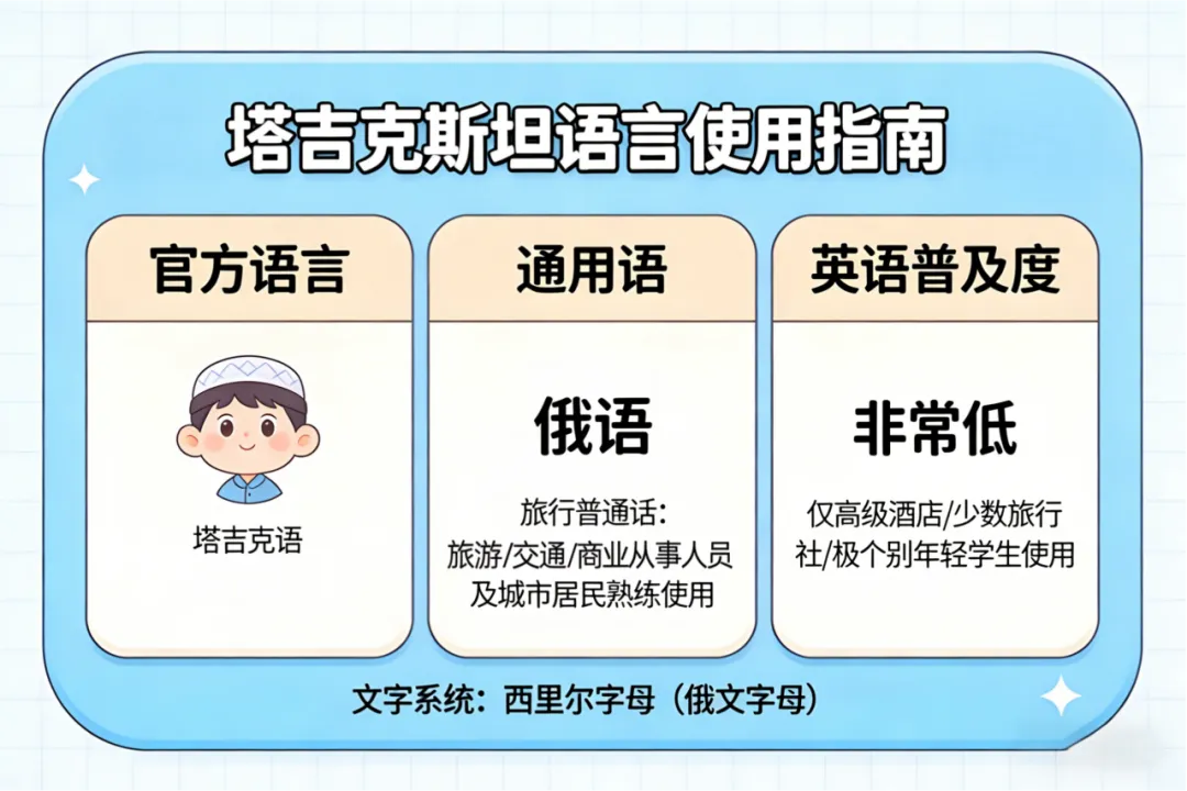 官方语言:塔吉克语(与波斯语/达里语非常接近)。