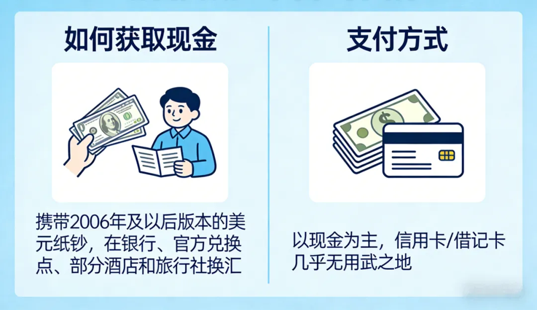 请务必从中国携带足够额度、崭新无损的美元现金。这是兑换索莫尼的唯一硬通货。必须是 2006年及以后版本、无任何折痕、污渍、笔迹的纸币。优先携带 100和50美元 面额,也备一些 1和5美元 小钞用于付小费或应急。旧版或破损美元会被拒收。