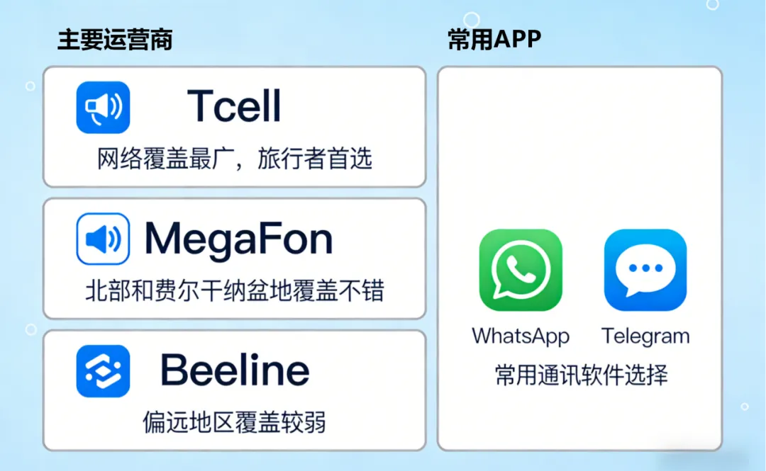 WhatsApp 和 Telegram 在当地使用更普遍,与司机、向导联系可能更方便。微信可以正常使用,但与国内联系需考虑时差。