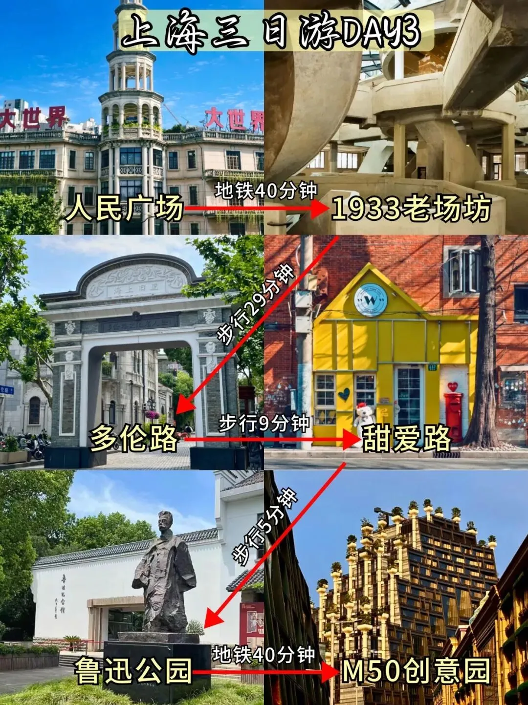上午:从人民广场出发,这里是上海的地理中心。之后前往1933老场坊,这座由宰牲场改造而成的创意园区,建筑本身极具特色,厚重的工业风非常适合拍照。 下午:探访多伦路文化名人街,这条短小的街道曾居住过鲁迅、茅盾等众多文化名人,充满历史气息。与之相邻的甜爱路,则是一条浪漫的小路,适合情侣散步。随后可前往鲁迅公园稍作休息。 傍晚:前往M50创意园。这里原是上海春明粗纺厂,如今聚集了众多画廊、艺术工作室和设计公司,是感受上海当代艺术氛围的好去处,常常有免费的展览可以参观。