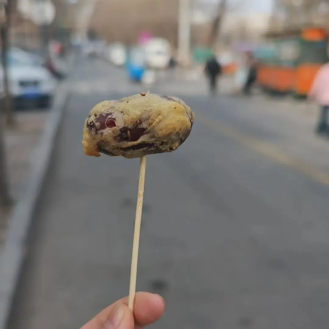 我买了个吊炉饼,和之前在沈阳吃到的味道一样,很满足。还尝了当地的小烧饼夹干肉丝,以及一个让我这个新疆人“长见识”的小吃:炸大枣。