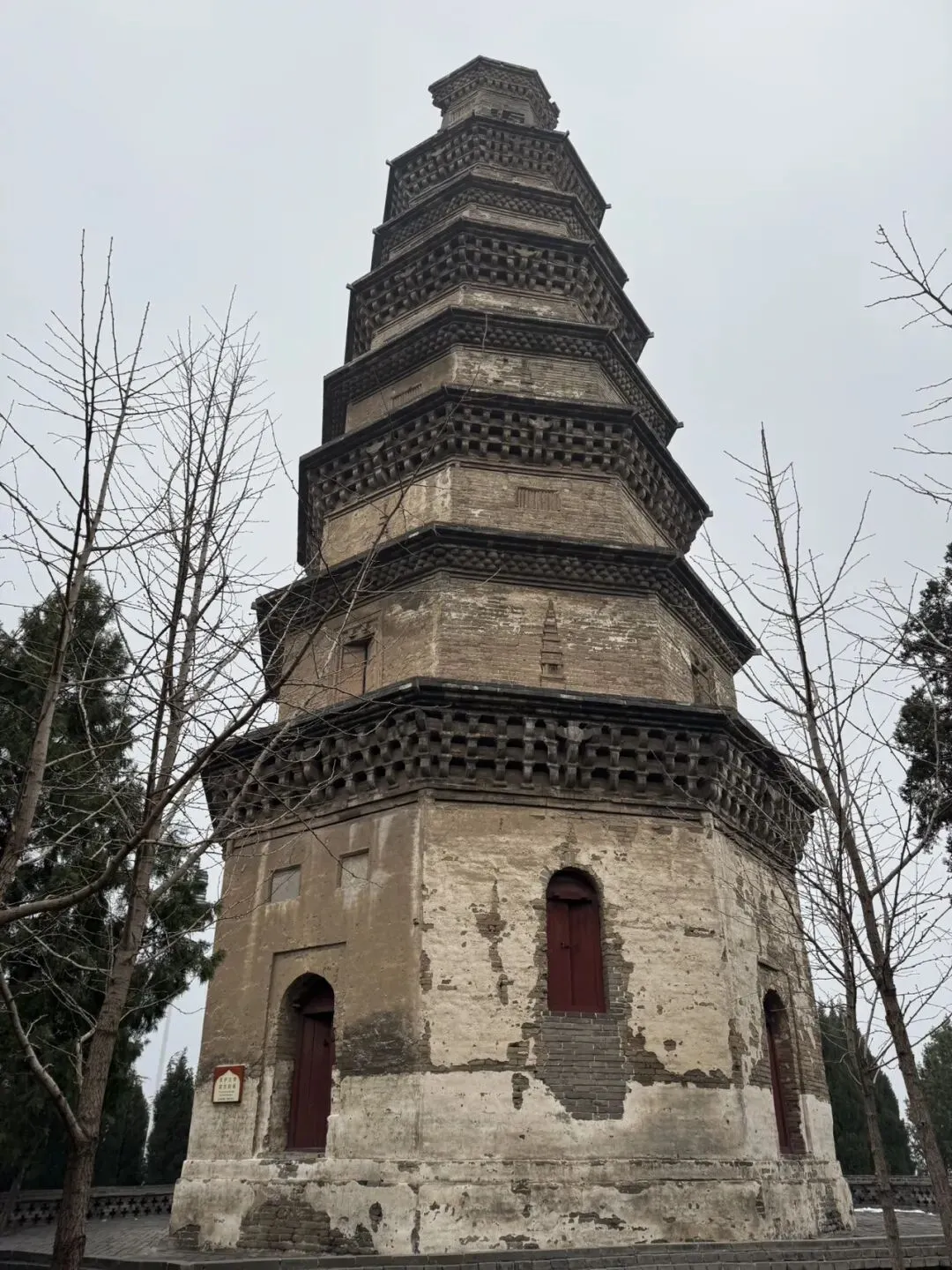 白塔也叫宋塔,是一座八角九级楼阁式砖塔,虽历经千年风雨,最上两层外墙已有些许剥落,第八层檐口损毁,但它依然残存着33.24米的身姿,倔强地耸立在蓝天之下。