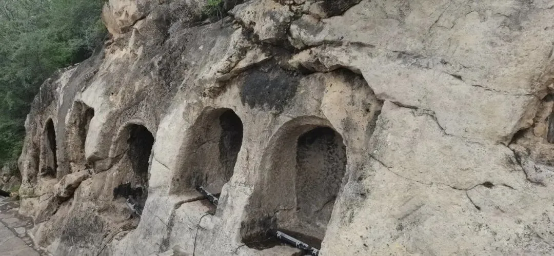 从常乐寺遗址出来,拾级而上,来到海拔约500米的半山腰处,这里便是北响堂山的石窟群,9座洞窟一字排开。