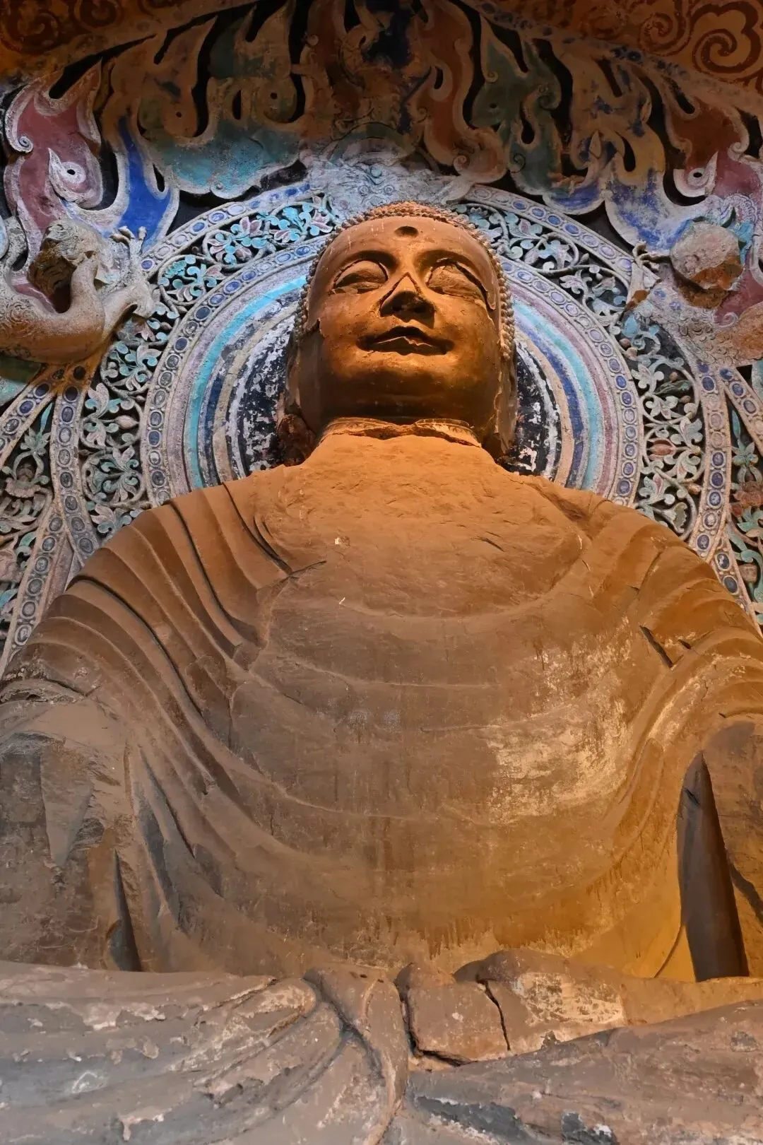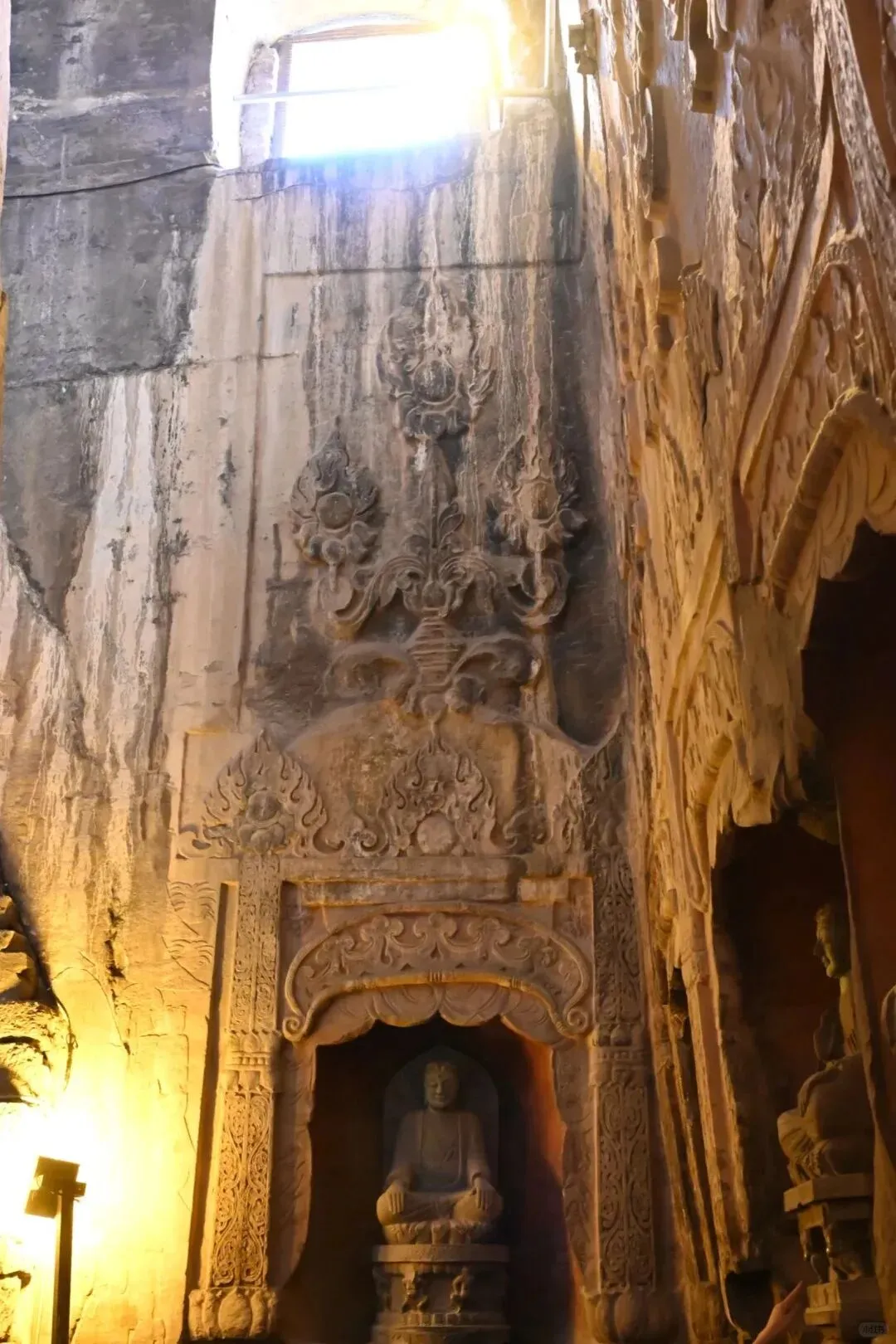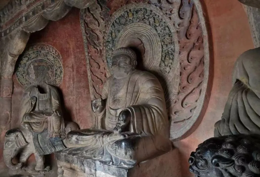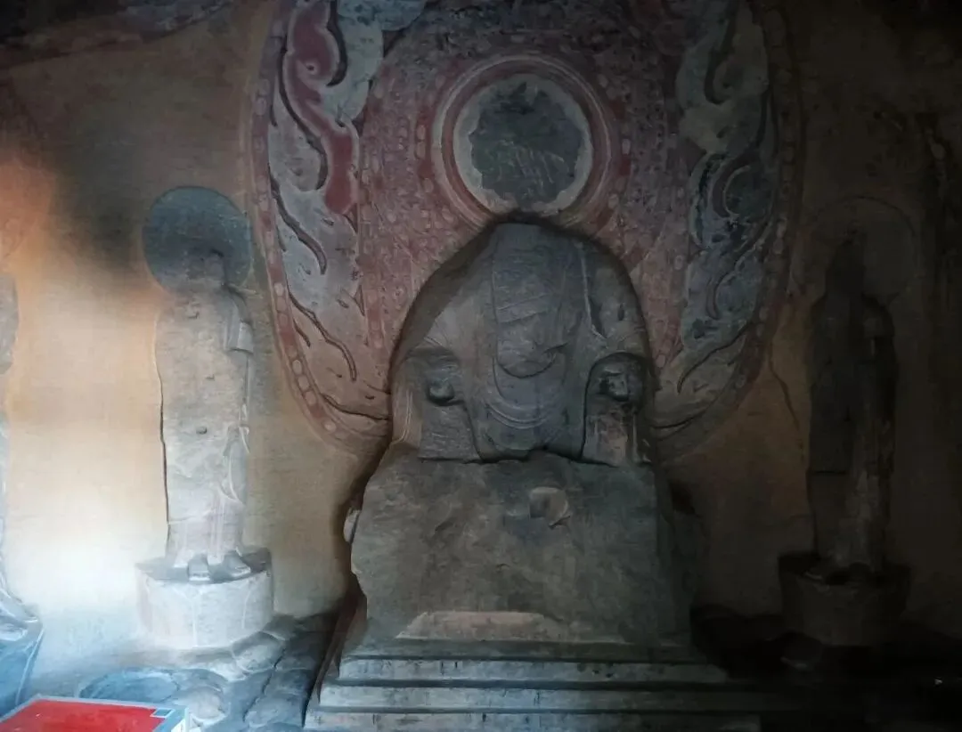 正面龛内,一尊高3.5米的释迦牟尼坐像端坐莲花台上。佛像的衣纹不再是厚重的线条,而是几条凹下的雕衣纹线贯穿全身,仿佛湿薄的纱衣紧贴肌肤,隐约透出肢体的轮廓。这种“曹衣出水”的风格,在北齐达到了极致。