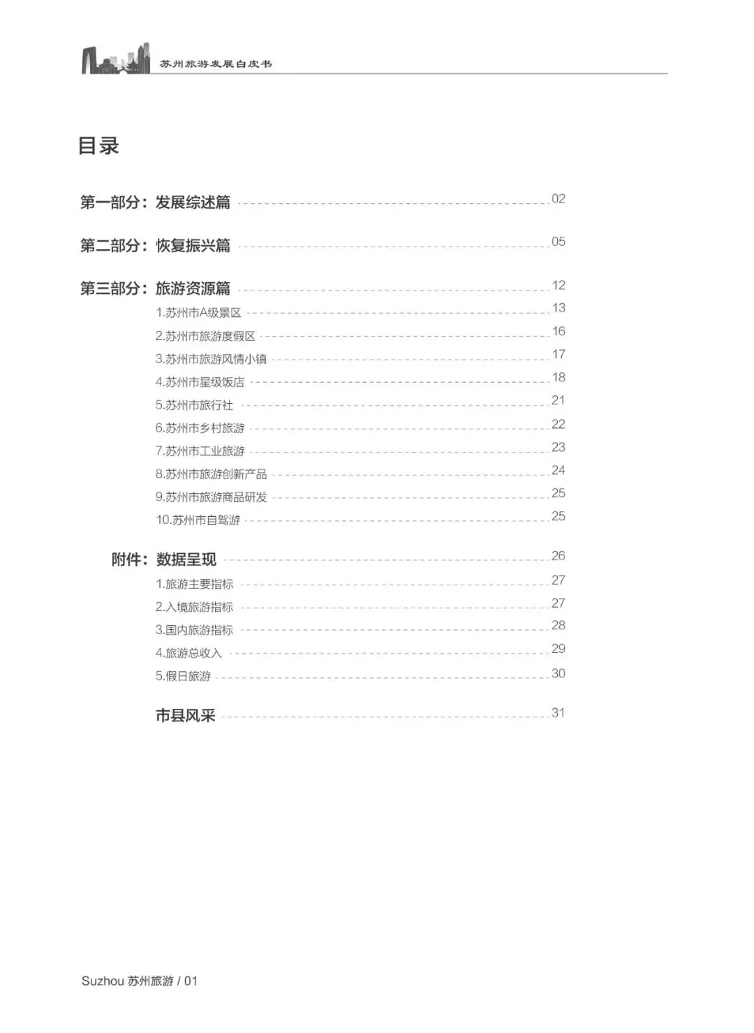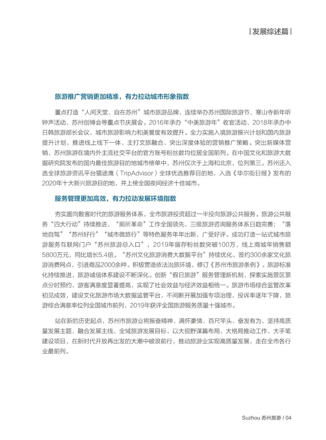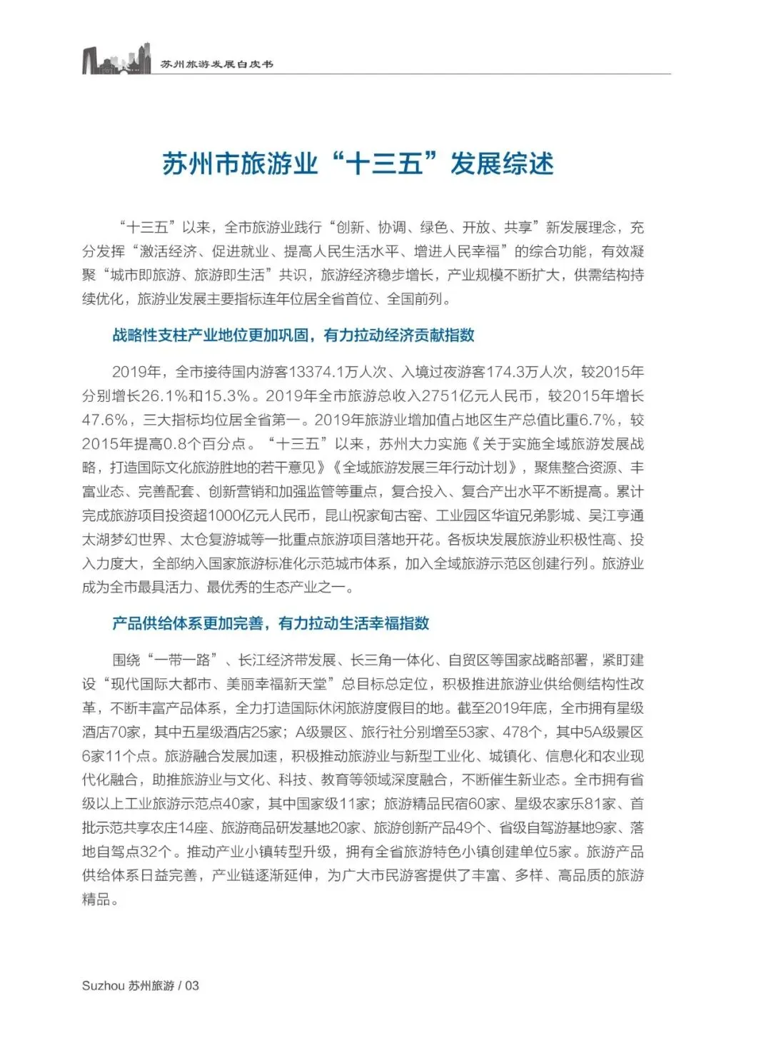 苏州旅游发展白皮书全面展示了苏州市在“十三五”期间及疫情后旅游业的发展情况,包括政策支持、资源开发、市场推广和行业服务等方面。白皮书强调了苏州作为“世界遗产典范城市”和“全球手工艺与民间艺术之都”的文化特色,以及其作为“人间天堂”的旅游吸引力。通过“以文塑旅、以旅彰文”的发展理念,苏州正致力于打造“现代国际大都市、美丽幸福新天堂”。