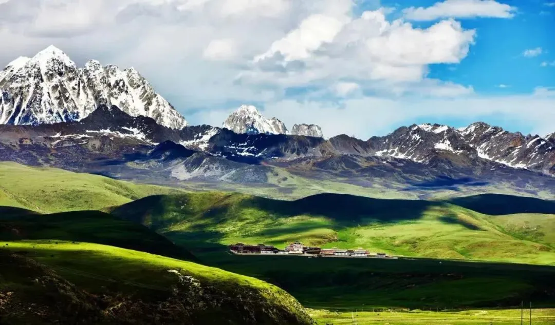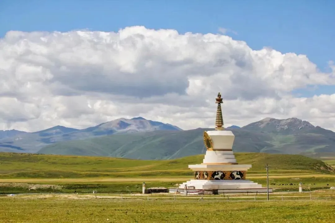 一望无垠的草原,茵茵绿色,牛羊成群,流云恣意。站在山坡,环顾两边,一边是地毯一样的辽阔无垠的草原,另一边是缓缓流动的潺潺流水和河谷。湖水的牛羊群、远处的皑皑峰顶,山下宏伟庄重的木雅金塔和拉雅雪山彼此交相辉映。