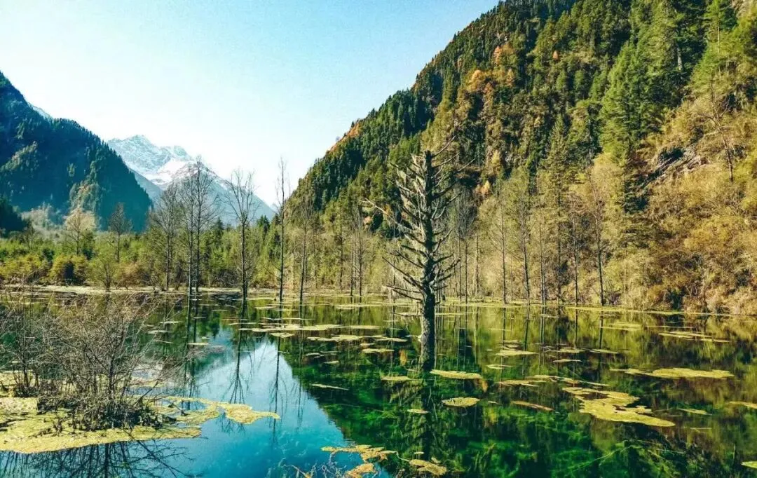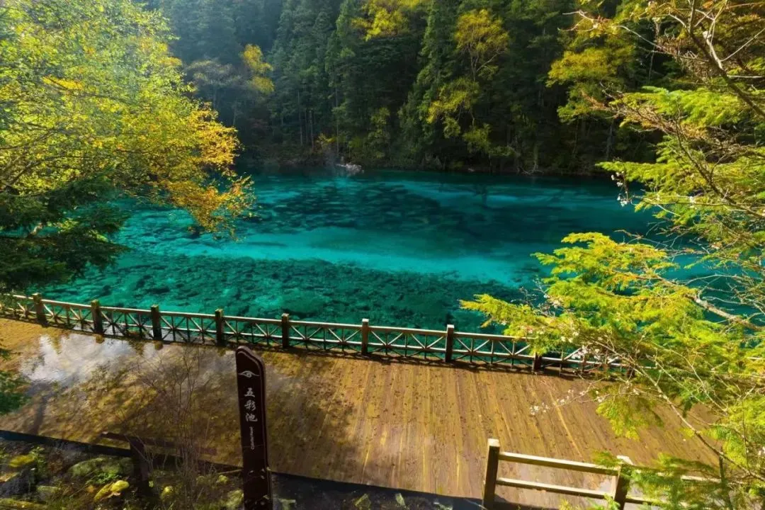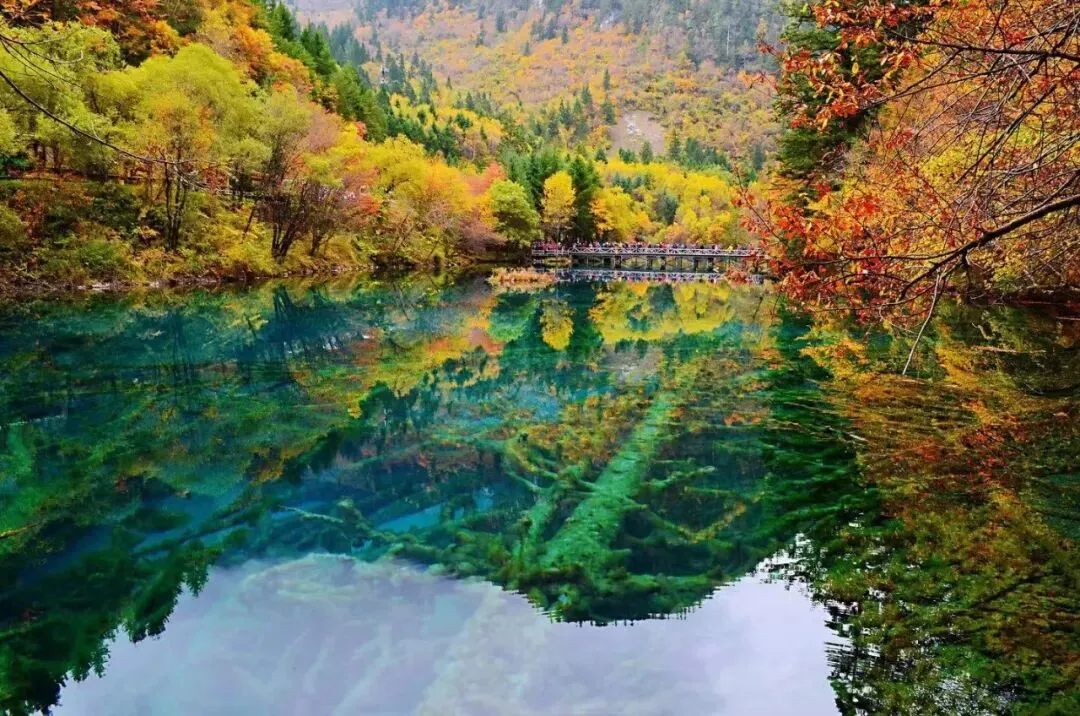 九寨的水清澈见底,层次不齐的水池布满山间,当阳光出来的时候射在水池中,就像一颗颗繁星在山谷里闪烁,潋滟如调色盘的海子变幻莫测,仿佛进入童话世界一般的景象。