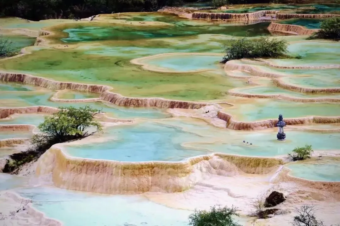 黄龙五彩池:形状不一、大小不同的池水颜色五彩斑斓,散播在密林中,如镶嵌在丛林中的珍珠,绚丽夺目
