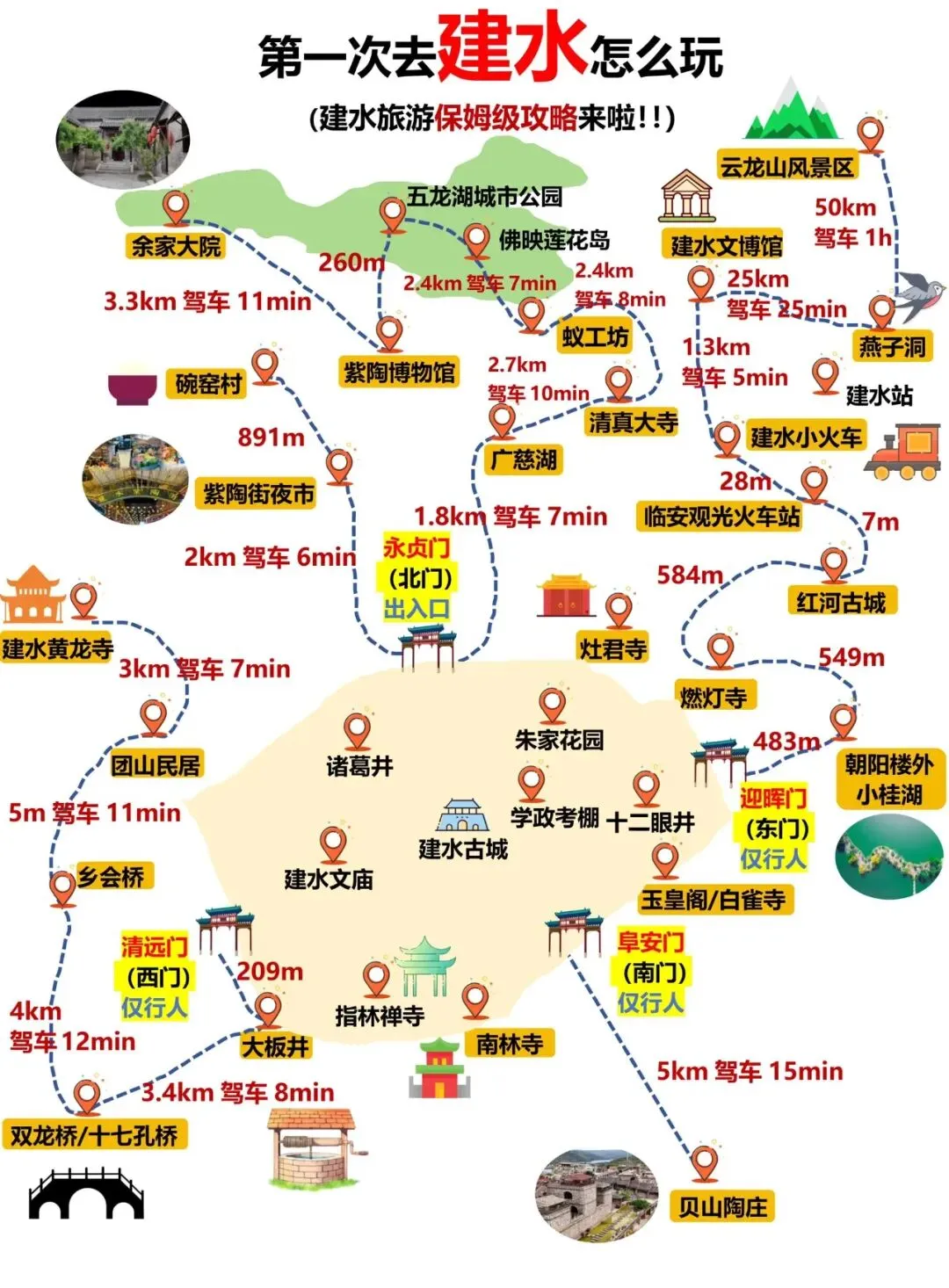 建水古城(免费)、米轨小火车(120元)、朱家花园(35元)、文庙(40元)、双龙桥(免费)、大板井(免费)、团山民居(35元)、蚁工坊(20元)、贝山陶庄(30元)