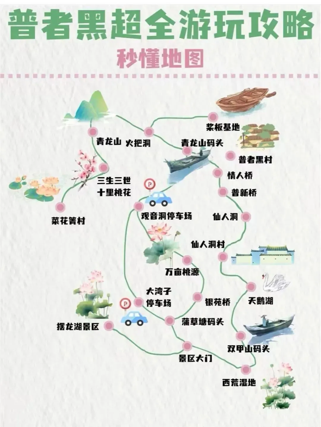 青龙山(免费)、情人桥(免费)、天鹅湖(80元)、仙人洞村(免费)、普者黑村(免费)、菜花箐(40元)、西荒湿地(免费)