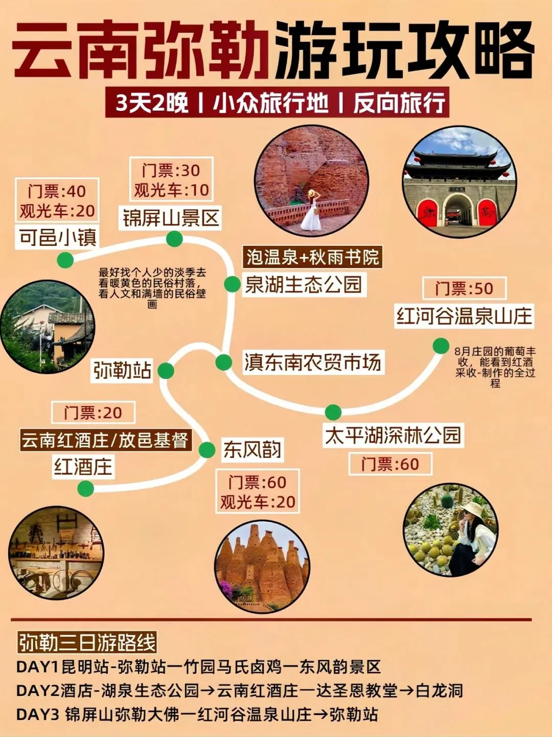 湖泉生态园(免费)、红河水乡(免费)、东风韵(80元)、太平湖森林公园(80元)、锦屏山(40元)、可邑小镇(40元)