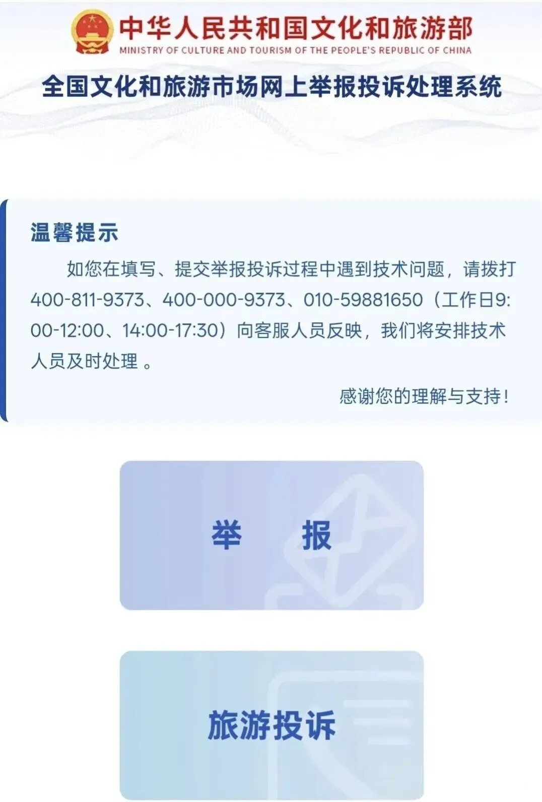 全国文化和旅游市场网上举报投诉处理系统