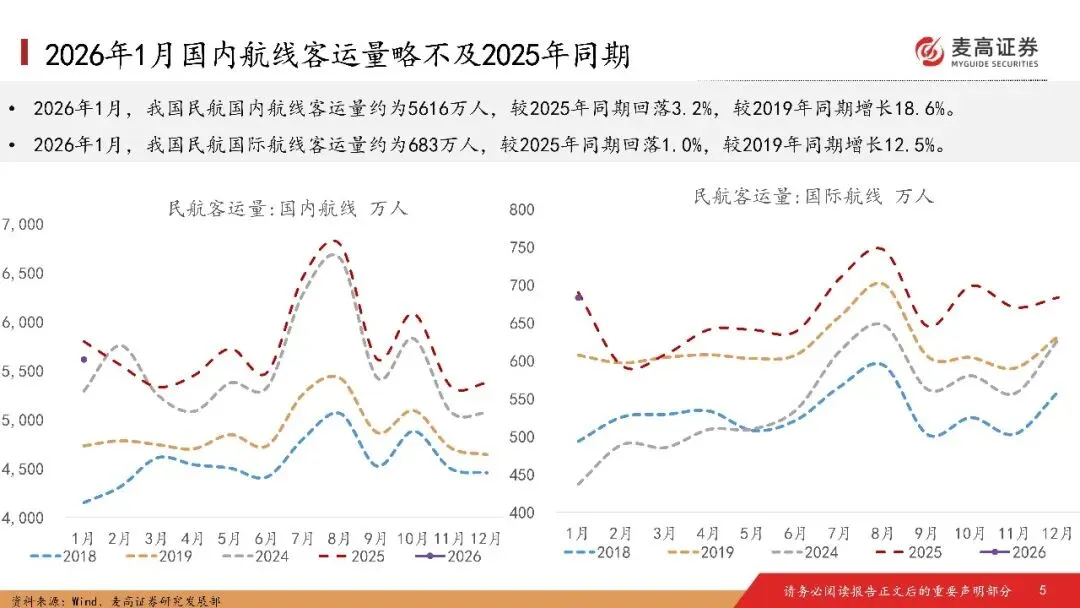 2026年1月,我国民航客运量约为6299万人,较2025年同期回落2.9%,较2019年同期增长17.9%。